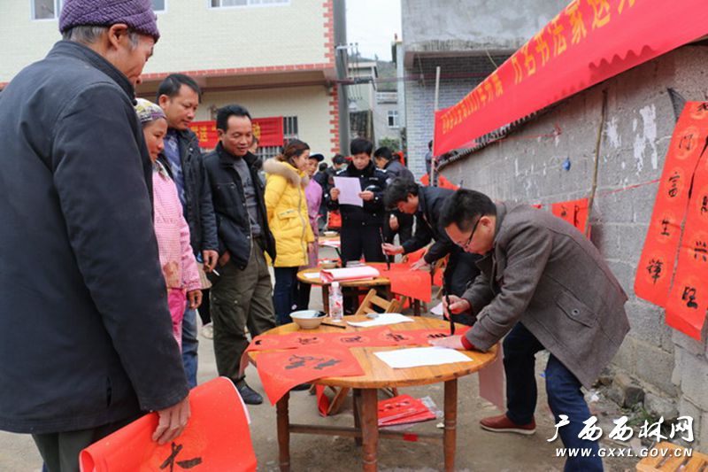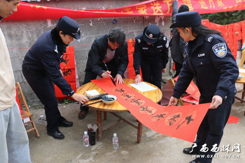 1月14日,西林縣公安局聯(lián)合縣文聯(lián)組織西林縣書法界的書法家、書法家志愿者服務(wù)隊(duì)及部分民警書法愛好者共21人一起下鄉(xiāng),開展“萬名書法家送‘!M(jìn)萬家”活動(dòng),為村民群眾寫春聯(lián)、送“!保A得群眾好評(píng)。 當(dāng)日上午8時(shí),該局分管指揮中心的局領(lǐng)導(dǎo)許愛秋率110指揮中心部分民警、協(xié)警會(huì)同縣文聯(lián)書法家協(xié)會(huì)的書法家們,冒著嚴(yán)寒到普合苗族鄉(xiāng)大河村為村民們寫春聯(lián)、送“!弊帧⒓踊顒(dòng)的書法家們充分發(fā)揮自己的書法特長,積極為群眾服務(wù)。村民們興高采烈,有的一家要求寫5、6副對(duì)聯(lián)。他們說:如今黨和國家的政策好了,自己建起了幾層小洋樓,春節(jié)快到了,今天有書法家來為他們寫對(duì)聯(lián)、有公安民警送“!眮砑遥噘N幾副春聯(lián)、多貼幾個(gè)“福”字,讓2017年春節(jié)更喜慶。一位年長的大爺更是不亦樂乎,他樂呵呵的來到書法家岑斌面前,要求岑斌為自己寫6副春聯(lián):“我家三層樓,每層兩個(gè)門口,我要寫6副……”在開展此項(xiàng)活動(dòng)中,民警、協(xié)警們除了主動(dòng)為村民們寫春聯(lián)、送“!弊,他們靈活機(jī)動(dòng),在下鄉(xiāng)來回的路上,堅(jiān)持遇到過往群眾就送春聯(lián)和送“福”字,盡量讓更多的人受益。 據(jù)統(tǒng)計(jì),參加活動(dòng)的同志當(dāng)天共為村民群眾寫春聯(lián)、送春聯(lián)306副、送“福”字418個(gè)。 |
