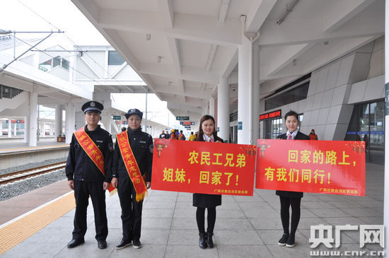 央廣網(wǎng)百色1月18日消息(通訊員 李心語 劉英瑛)1月18日15時08分,從廣州南站發(fā)出的D3782次愛心專列,免費載著634名在粵務(wù)工的百色籍同鄉(xiāng)安全返家。 “到了到了!”,百色火車站派出所年輕民警在站臺與車內(nèi)的乘客揮手示意。待列車停穩(wěn),老鄉(xiāng)們拎著行李、抱著孩子蜂擁而下。民警們隨即迎上去,搭手幫忙,一直送到百色市就業(yè)服務(wù)中心安排的2輛公共汽車上。 田陽縣的老陸一家免費乘車返鄉(xiāng),本來就已驚喜萬分,這一下車又是一個驚喜:“沒有想到還有車站民警幫我拿行李,提醒我們注意安全,出站也有民警維持秩序,感覺很貼心、很溫暖”。 據(jù)悉,2017年春運期間,兩廣聯(lián)合開展“精準扶貧滿關(guān)愛,回家路上暖人心”主題活動,送在粵百色籍的貧困務(wù)工人員返鄉(xiāng)過年。 |