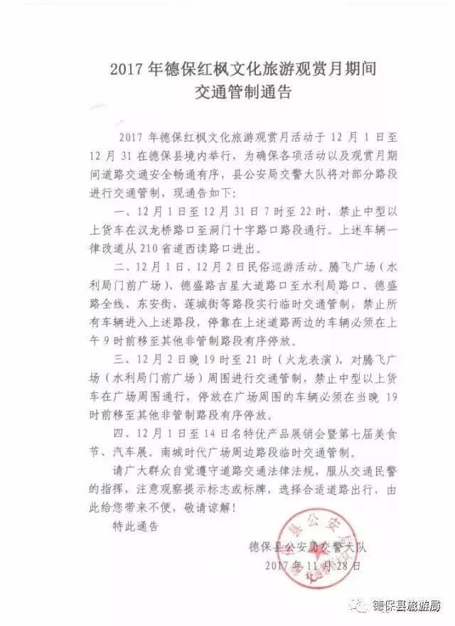 萬人矚目的德?h紅楓文化旅游觀賞月活動(dòng)將在12月2日精彩上演,屆時(shí),大型特色民俗巡演、火龍表演、德保首屆臍橙節(jié)暨扶貧產(chǎn)業(yè)產(chǎn)品成果展銷會(huì)等一系列濃厚的特色活動(dòng)將輪番上演,華彩綻放…… 旅游節(jié)中的重頭戲——民俗巡游已經(jīng)在12月1日進(jìn)行了最后的彩排,盡管天氣有點(diǎn)陰霾,依然抵擋不了德保人民對本次盛會(huì)的激情。彩排現(xiàn)場展示矮馬方陣、油帽方陣、舞龍方陣、舞獅方陣、舞象方陣、末倫方陣、麥稈花籃方陣、臺閣方陣、壯拳方陣及龍鯉魚方陣。 那么,今年的民俗文化巡游路線是哪里 活動(dòng)亮點(diǎn)有哪些 還有你最最關(guān)心的交通路段管制 小編通通告訴你 民俗巡游表演 時(shí)間:2017年12月2日(星期六) 地點(diǎn):騰飛廣場 油帽方陣▲ 舞獅方陣▲ 舞龍方陣▲ 舞象方陣▲ 龍鯉魚方陣▲ 末倫方陣▲ 麥稈花籃方陣▲ 矮馬方陣▲ 臺閣方陣▲ 壯拳方陣▲ 巡 游 路 線 ◆舞龍、舞獅開光儀式(地點(diǎn):芳山文體公園) ◆巡游表演路線安排:從騰飛廣場(主會(huì)場,第一表演點(diǎn))開始,沿吉星路—德盛路—舊車站(第二表演點(diǎn))—體育館—縣人民醫(yī)院—德保高中—蓮城街—縣政府大院門口(第三表演點(diǎn)) 火 龍 表 演 時(shí)間:2017年12月2日(星期六)晚上 地點(diǎn):云山大道 6條火龍于場中間舞動(dòng),工作人員、領(lǐng)導(dǎo)嘉賓、游客點(diǎn)燃煙花灑向龍身,形成龍游煙花煙火的絢麗場景。 德保首屆臍橙節(jié)暨扶貧產(chǎn)業(yè)產(chǎn)品成果展銷會(huì) 時(shí)間:2017年12月2日至15日 地點(diǎn):財(cái)富廣場 展銷德保臍橙,展現(xiàn)德保脫貧攻堅(jiān)主打產(chǎn)業(yè)發(fā)展出成果。 為了大家文化旅游節(jié)期間不堵堵堵 這份交通管制通告你有必要知道 一、活動(dòng)期間,途經(jīng)交通臨時(shí)管控區(qū)域的公交線路將臨時(shí)調(diào)整線路,請廣大居民群眾理解配合,提前安排好生活出行、提倡在此期間盡量選擇使用公共交通工具或“綠色”出行。 二、駕駛員要服從指揮和管理,自覺維護(hù)交通秩序。 三、觀眾要避免過度聚集,防止發(fā)生踩踏事件,不要攀爬樹木、電線桿、廣告牌。 四、建議老人及身體不便的人員盡量不要在擁擠的人流中聚集,家長要注意兒童。 |