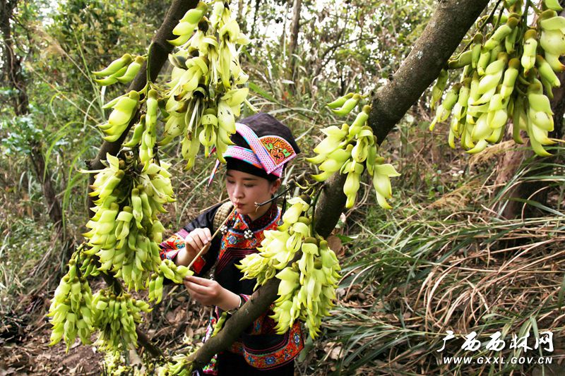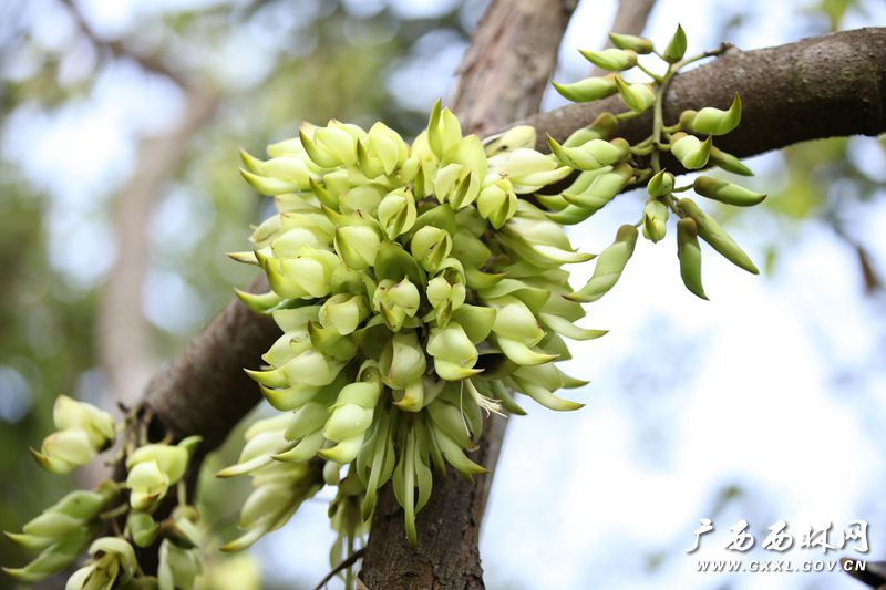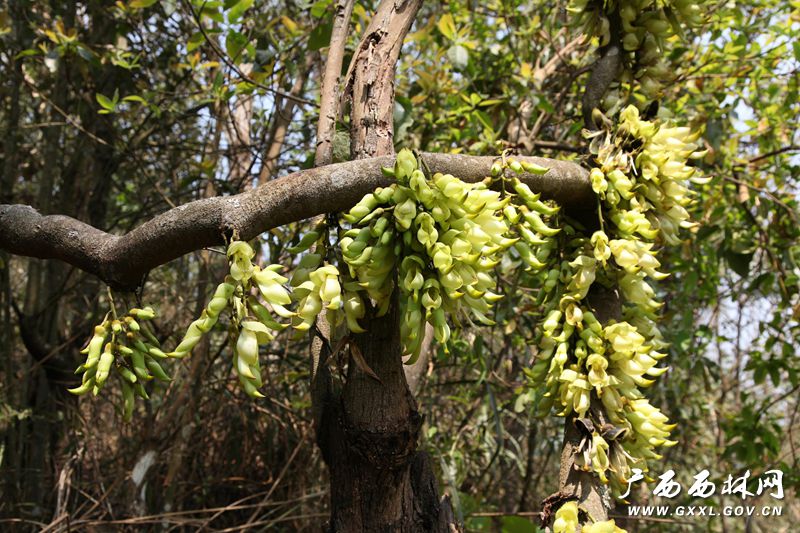 近日來,在西林縣城周邊的樹叢和山谷中開滿了神秘的句町花(“句邪花”)。此花呈米黃色,有四瓣,每串二三十朵,由一青綠色小藤串連,一串串掛于樹間,綿連不斷,給西林縣增添了一道濃濃的春意。 西林縣句町花(“句邪花”)又名老鴉藤花、紅血藤花等,屬于豆科崖豆藤屬的植物,花性喜溫暖濕潤氣候,耐陰耐旱,畏嚴(yán)寒。它是一種季節(jié)性植物,生性強健,生長迅速,攀援力強,花期3-5月。花蕊香氣馥郁,堆積有甘甜的汁液,滋味醇厚甘鮮,入口甘帶蜜味,可用小蘆葦枝干進(jìn)行吸喝,常引來路人品賞。 據(jù)悉,“句邪”是“山神之藤”,西林作為句町古國故地,千百年來,當(dāng)?shù)厝罕妼Υ嘶捌涑绨,將它視為美滿和理想的化身而熱情歌頌,也深得人們的贊賞和喜愛。故將此花作為國花。 |