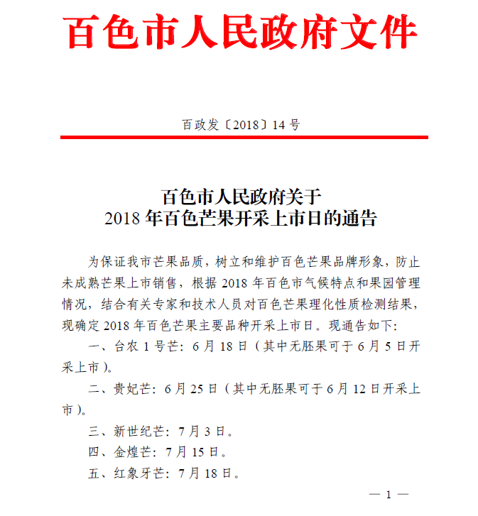 百色市人民政府關(guān)于2018年百色芒果開采上市日的通告 為保證我市芒果品質(zhì),樹立和維護(hù)百色芒果品牌形象,防止未成熟芒果上市銷售,根據(jù)2018年百色市氣候特點(diǎn)和果園管理情況,結(jié)合有關(guān)專家和技術(shù)人員對百色芒果理化性質(zhì)檢測結(jié)果,現(xiàn)確定2018年百色芒果主要品種開釆上市日。現(xiàn)通告如下: 一、臺農(nóng)1號芒:6月18日(其中無胚果可于6月5曰開采上市)。 二、貴妃芒:6月25日(其中無胚果可于6月12日開采上市)。 三、新世紀(jì)芒:7月3日。 四、金煌芒:7月15曰。 五、紅象牙芒:7月18日。 六、熱農(nóng)1號芒:7月22日。 七、桂熱芒82號、玉文芒:7月23曰。 八、紅芒6號:8月5日。 九、凱特芒:8月15日。 十、桂熱芒10號:8月20曰。 十一、其它品種參照以上早、中、晚熟品種上市時間開采上市。各種植戶(合作社、企業(yè))要按照通告的規(guī)定執(zhí)行,不得在芒果開采上市日前采摘上市;任何經(jīng)營主體不得在芒果開采上市曰前進(jìn)入果場、批發(fā)市場等收購芒果。各縣(市、區(qū))人民政府,各級農(nóng)業(yè)、工商、質(zhì)監(jiān)、商務(wù)等相關(guān)職能部門要加大政策宣傳力度,做好執(zhí)法檢查等工作,切實(shí)維護(hù)百色芒果良好的生產(chǎn)銷售秩序。 |
