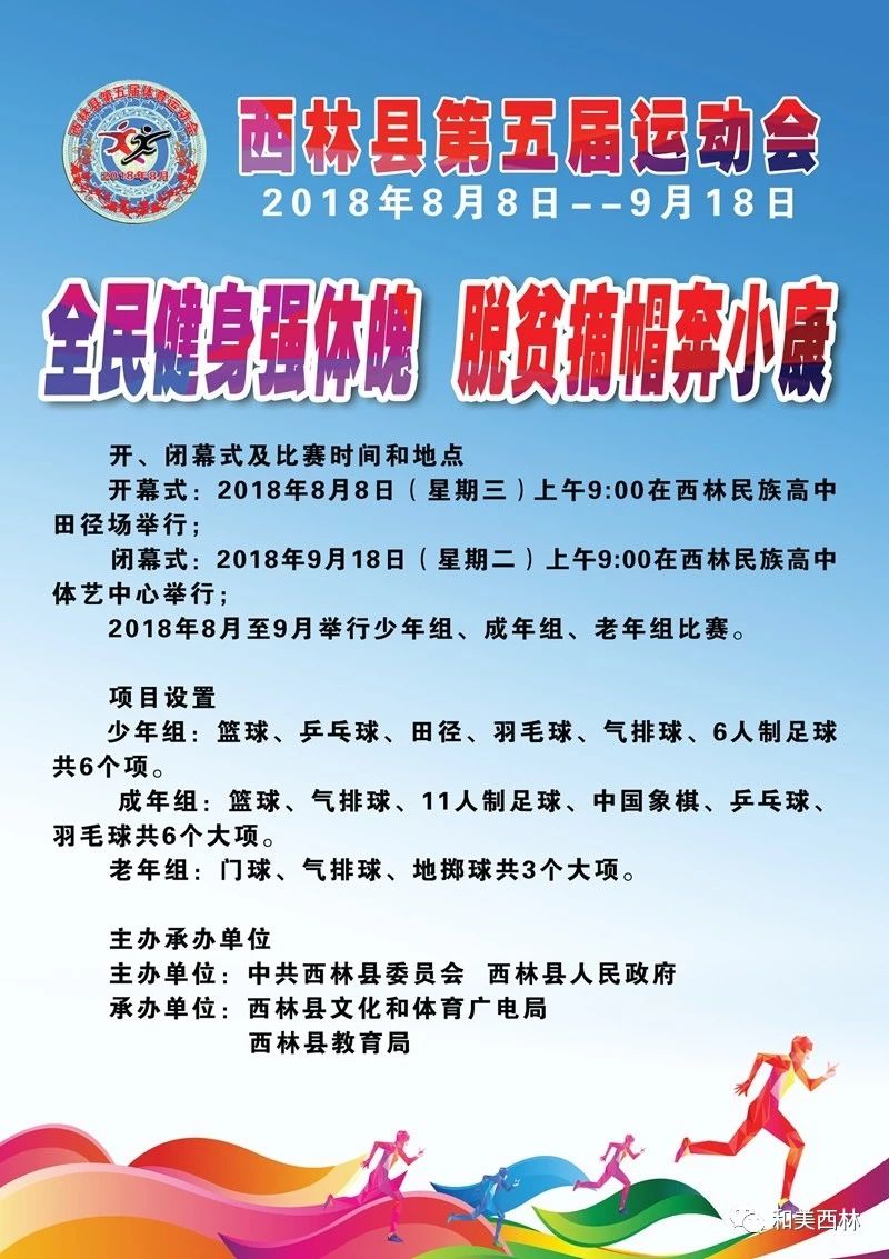 為全面貫徹黨的十九大精神,深入落實(shí)習(xí)近平總書記系列重要講話精神尤其是對體育工作重要批示指示精神,進(jìn)一步推動我縣全民健身和競技體育全面發(fā)展,充分體現(xiàn)體育為民的宗旨,更好地實(shí)施體育惠民舉措,滿足廣大群眾欣賞體育賽事、參與體育健身的需求;同時為充分展示和檢驗(yàn)我縣競技體育水平,發(fā)掘一批優(yōu)秀體育運(yùn)動人才,提高全縣人民身體素質(zhì)和健康水平,推動全縣體育事業(yè)全面、可持續(xù)發(fā)展?h委、縣人民政府決定舉辦西林縣第五屆運(yùn)動會。