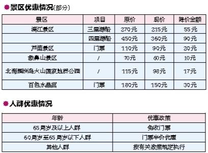 本報(bào)訊(記者 孟娟娟)國(guó)慶出游福利來啦!昨日,記者從自治區(qū)物價(jià)局獲悉,根據(jù)中央部署,廣西陸續(xù)降低國(guó)有景區(qū)門票價(jià)格。據(jù)統(tǒng)計(jì),截至昨日,全區(qū)已降低或在國(guó)慶前降低價(jià)格的景區(qū)共99個(gè),降價(jià)幅度大部分在20%左右,有的甚至達(dá)30%。 今年以來,廣西各級(jí)價(jià)格主管部門加快完善景區(qū)門票價(jià)格形成機(jī)制,加強(qiáng)旅游服務(wù)價(jià)格管理,著力做好降低重點(diǎn)國(guó)有景區(qū)門票價(jià)格工作。 在9月1日前,廣西分別降低了桂林象山景區(qū)等11個(gè)景區(qū)價(jià)格。9月13日,自治區(qū)物價(jià)局再次下發(fā)緊急通知,要求在今年“十一”黃金周前再降低一批重點(diǎn)國(guó)有景區(qū)門票價(jià)格。降價(jià)范圍為重點(diǎn)5A景區(qū)和現(xiàn)行價(jià)格水平較高的4A景區(qū)門票價(jià)格,并積極推動(dòng)其他景區(qū)門票價(jià)格降低。要求降價(jià)幅度原則上不低于20%,景區(qū)交通(游覽觀光車、游船)、索道等票價(jià)偏高的也要降低。 同時(shí),廣西還關(guān)愛老人,落實(shí)老年人門票價(jià)格優(yōu)惠政策。要求實(shí)行政府定價(jià)或指導(dǎo)價(jià)管理的風(fēng)景名勝區(qū)等旅游景區(qū)景點(diǎn),對(duì)65周歲及以上老年人免收門票,對(duì)60周歲至65周歲以下的老年人實(shí)行門票半價(jià)優(yōu)惠。其他人群價(jià)格優(yōu)惠按有關(guān)政策規(guī)定執(zhí)行。 下一步,廣西還將積極推動(dòng)4A及以下國(guó)有景區(qū)降價(jià)。 |