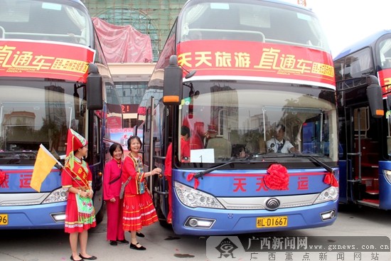 4月30日,百色旅游直通車首發(fā)儀式在百色市高鐵站進站大道南大世紀廣場舉行。記者從百色市旅游發(fā)展委員會了解到,從4月30日起,游客可以在百色城區(qū)乘車直達大王嶺、田州古城、通靈大峽谷、舊州、鵝泉、樂業(yè)大石圍天坑等景區(qū)。 首發(fā)儀式當(dāng)天,100多名游客坐上直通車,直達旅游景區(qū)門口!奥糜沃蓖ㄜ噷>開通對游客來說非常有利,我們一下高鐵就可以乘車到達景區(qū),省去了轉(zhuǎn)車、找路的麻煩!崩"五一"假期到百色旅游的游客黃雷說。據(jù)了解,旅游專線直通車開通后,將進一步完善百色旅游公共服務(wù)功能,改善百色旅游交通條件,為游客提供便捷的旅游交通服務(wù)。 |