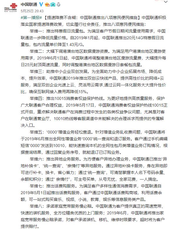 根據(jù)國家“提速降價”的號召,三大運營商在這兩年來均紛紛推動資費下調(diào),和4G網(wǎng)絡(luò)推出早期相比,實際上我們能用到的網(wǎng)絡(luò)資費套餐已經(jīng)劃算了不少。在5G網(wǎng)絡(luò)即將到來之際,4G網(wǎng)絡(luò)的資費的性價比也來到了最高點。 5月25日晚,中國聯(lián)通突然發(fā)出公告,宣布八項便民措施。這八項措施雖然和資費套餐沒有直接關(guān)聯(lián),但顯然能在一定程度上提升中國聯(lián)通用戶的網(wǎng)絡(luò)使用體驗,不失為一個提升滿意度的好舉措。 中國聯(lián)通方面表示,積極落實國家提速降費政策,切實履行社會責(zé)任,推出八項惠民便民措施,具體如下: 1、推出特惠假日流量包 為滿足客戶節(jié)假日期間流量使用需求,中國聯(lián)通進一步降低流量價格。自2019年1月起,中國聯(lián)通推出20元14G特惠假日流量包,包內(nèi)流量單價降至1.43元/G。 2、大幅下調(diào)港澳臺地區(qū)數(shù)據(jù)漫游資費 為滿足用戶港澳臺地區(qū)漫游使用需求,2019年6月1日起,中國聯(lián)通將調(diào)整港澳臺地區(qū)漫游流量費,大幅提升每日25元封頂高速流量,同時調(diào)整港澳臺地區(qū)數(shù)據(jù)漫游日套餐包流量。 3、助推中小企業(yè)雙創(chuàng)發(fā)展 為全面助力中小企業(yè)拓展市場、降低成本、提升效率,中國聯(lián)通2019年推出雙創(chuàng)云快線產(chǎn)品,提供高性價比的網(wǎng)絡(luò)+云服務(wù),滿足雙創(chuàng)企業(yè)光速上云、靈活用云需求,通過云網(wǎng)一體化服務(wù)大大提升性價比,確;ヂ(lián)網(wǎng)接入費用再降低15%。 4、推出10015消費者權(quán)益保護熱線 為更好地提供高質(zhì)量服務(wù),保護廣大聯(lián)通客戶合理權(quán)益,2019年5月17日,中國聯(lián)通消費者權(quán)益保護熱線10015正式開啟,重點解決聯(lián)通客戶在消費過程中發(fā)生的各類權(quán)益爭議問題,尤其是對客戶在聯(lián)通營業(yè)廳、10010熱線等客服渠道中未能解決的合理訴求而提供的專屬解決入口。 5、“0000”增值業(yè)務(wù)輕松查退 針對增值業(yè)務(wù)亂收費問題,中國聯(lián)通將于2019年6月推出全網(wǎng)性增值業(yè)務(wù)“0000”統(tǒng)一查詢和退訂服務(wù)?蛻敉ㄟ^手機編輯短信“0000”發(fā)送到10010,能快速查詢本機的全網(wǎng)性包月類增值業(yè)務(wù)訂購情況,根據(jù)查詢結(jié)果,通過回復(fù)業(yè)務(wù)序號,就能退訂已訂購業(yè)務(wù)。 6、推出異地業(yè)務(wù)服務(wù) 為方便客戶異地辦理業(yè)務(wù),中國聯(lián)通已推出“異地補換卡”、“統(tǒng)一查詢”、“親情付”等異地服務(wù)。通過異地補換卡服務(wù),身在異地即可進行補卡、換卡,省心省力;通過“統(tǒng)一查詢”,可清楚掌握本人名下號碼余量、余額和積分;通過“ 親情付”,可主號買單,從號無憂,全家花費,一人搞定。 7、推出話費購服務(wù) 為滿足客戶多樣性通信消費需求,中國聯(lián)通自2019年5月1日起推出話費購服務(wù),客戶通過中國聯(lián)通話費購商城,利用話費余額,可一站式購買音樂、視頻、小說、教育、娛樂等信息服務(wù)類產(chǎn)品。 8、承諾家庭寬帶服務(wù)慢必賠 中國聯(lián)通為客戶提供真正的高速寬帶、快速的裝機服務(wù)、全方位精良優(yōu)質(zhì)的上門服務(wù);2019年6月,中國聯(lián)通將推出家庭寬帶服務(wù)慢必賠承諾,對客戶承諾裝機、移機、維修時限要求,超時將為客戶提供賠付。 對于這8項措施,網(wǎng)友紛紛留言表示支持,有博主甚至迫不及待要從移動轉(zhuǎn)向聯(lián)通。 聯(lián)通表示,始終牢記使命,用心履行企業(yè)責(zé)任,未來將推出更多惠民便民舉措,建設(shè)精品網(wǎng)絡(luò),降低資費水平,提升服務(wù)質(zhì)量,以實實在在的企業(yè)行動,提升廣大客戶的幸福感。 |