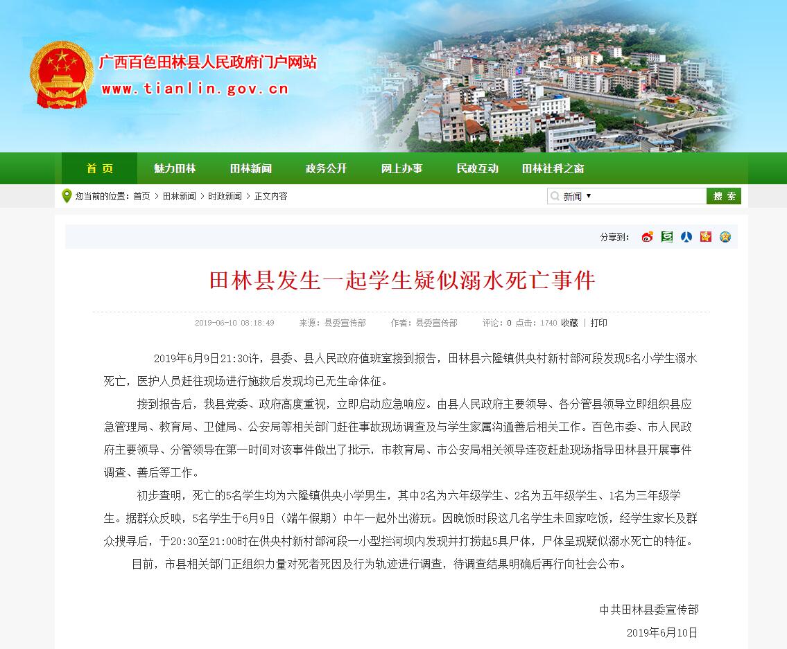 6月9日21:30許,田林縣六隆鎮(zhèn)供央村新村部河段發(fā)現(xiàn)5名小學(xué)生溺水死亡,醫(yī)護(hù)人員趕往現(xiàn)場進(jìn)行施救后發(fā)現(xiàn)均已無生命體征。 初步查明,死亡的5名學(xué)生均為六隆鎮(zhèn)供央小學(xué)男生,其中2名為六年級學(xué)生、2名為五年級學(xué)生、1名為三年級學(xué)生。據(jù)群眾反映,5名學(xué)生于6月9日(端午假期)中午一起外出游玩。因晚飯時段這幾名學(xué)生未回家吃飯,經(jīng)學(xué)生家長及群眾搜尋后,于20:30至21:00時在供央村新村部河段一小型攔河壩內(nèi)發(fā)現(xiàn)并打撈起5具尸體,尸體呈現(xiàn)疑似溺水死亡的特征。 目前,市縣相關(guān)部門正組織力量對死者死因及行為軌跡進(jìn)行調(diào)查,待調(diào)查結(jié)果明確后再行向社會公布。 (田林縣人民政府網(wǎng)站截圖) |