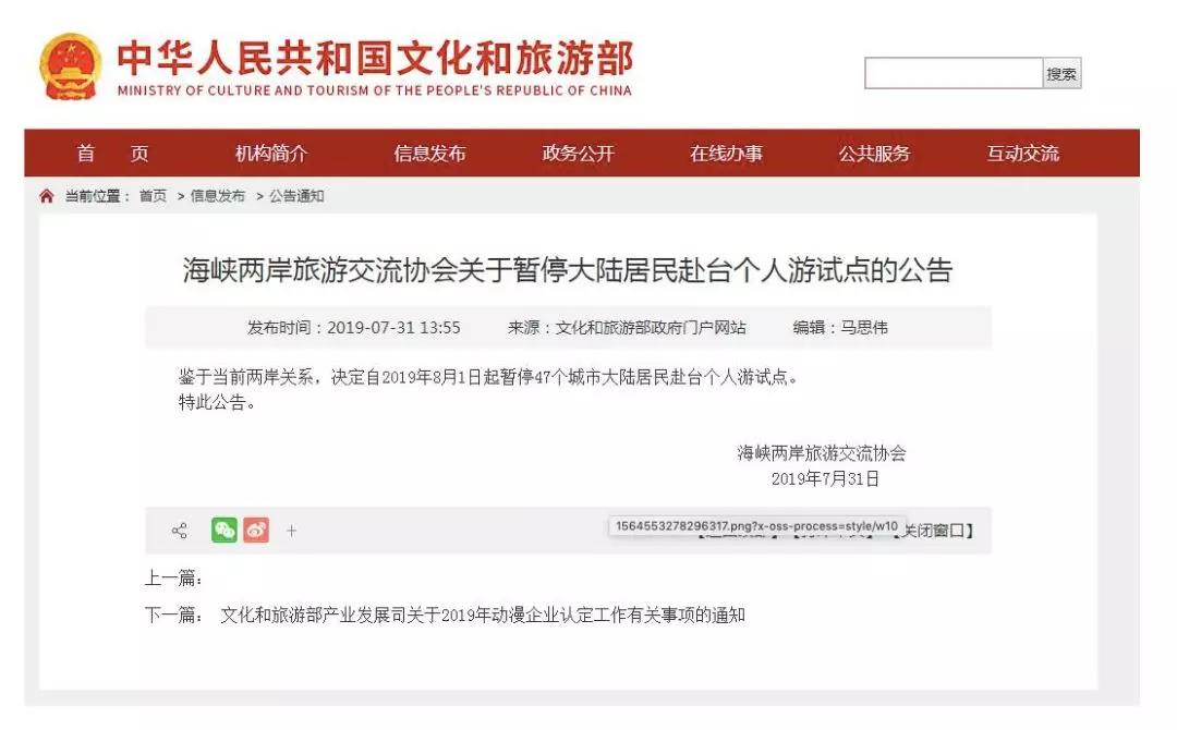 據(jù)文化和旅游部網(wǎng)站消息,海峽兩岸旅游交流協(xié)會(huì)公告稱(chēng),鑒于當(dāng)前兩岸關(guān)系,決定自2019年8月1日起暫停47個(gè)城市大陸居民赴臺(tái)個(gè)人游試點(diǎn)。 此前,自2011年6月28日,上海、北京、廈門(mén)三個(gè)城市率先開(kāi)放赴臺(tái)自由行以來(lái),一共開(kāi)放了5批47個(gè)城市。 第一批(3個(gè)):北京、上海、廈門(mén)。 第二批(10個(gè)):天津、南京、重慶、成都、廣州、杭州、深圳、福州、濟(jì)南、西安。 第三批(13個(gè)):蘇州、武漢、寧波、青島、鄭州、沈陽(yáng)、長(zhǎng)春、石家莊、長(zhǎng)沙、昆明、南寧、合肥、泉州。 第四批(10個(gè)):哈爾濱、太原、南昌、貴陽(yáng)、大連、無(wú)錫、溫州、中山、煙臺(tái)、漳州。 第五批(11個(gè)):?凇⒑艉秃铺、蘭州、銀川、常州、舟山、惠州、威海、龍巖、桂林、徐州。 |