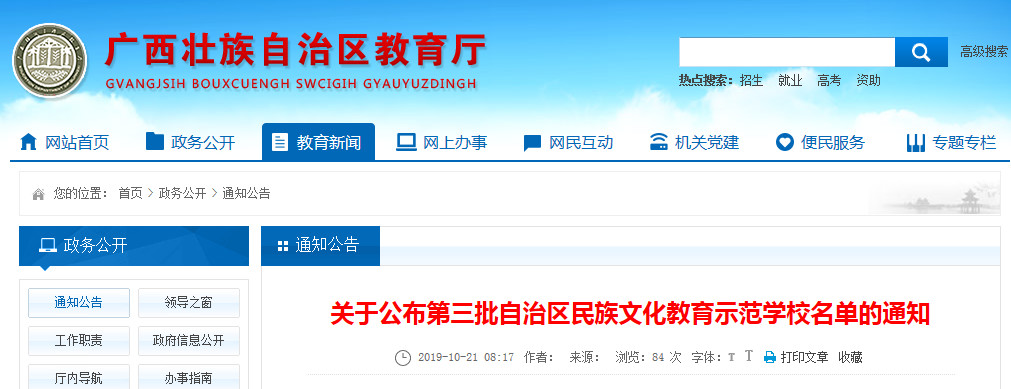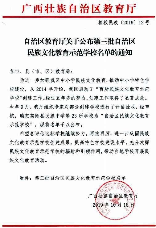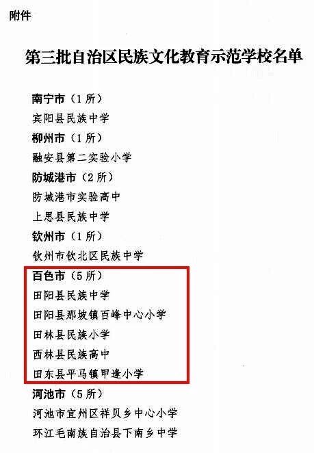 近日,自治區(qū)教育廳印發(fā)了《關于公布第三批自治區(qū)民族文化教育示范學校名單的通知》,公布了全區(qū)23所學校為“自治區(qū)民族文化教育示范學!,其中百色市5所學校榜上有名,它們是田陽縣民族中學、田陽縣那坡鎮(zhèn)百峰中心、田林縣民族小學、西林縣民族高中、田東縣平馬鎮(zhèn)甲逢小學。 ▲廣西教育廳網站截圖 為進一步加強全區(qū)中小學民族文化教育,推動中小學特色學校建設,從2014年開始,自治區(qū)啟動了“百所民族文化教育示范學!眲(chuàng)建工作。經過5年多努力,創(chuàng)建工作取得了顯著成效。今年9月,自治區(qū)教育廳組織專家對部分創(chuàng)建學校進行了評估驗收,經審核,確定了23所學校為“自治區(qū)民族文化教育示范學!。 |