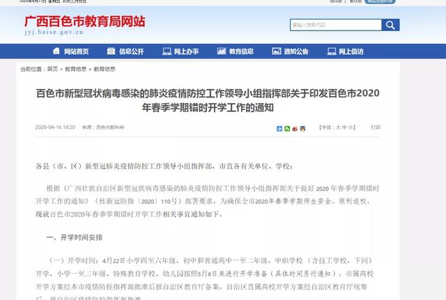 4月15日,百色市新冠肺炎疫情防控指揮部印發(fā)《百色市新型冠狀病毒感染的肺炎疫情防控工作領(lǐng)導(dǎo)小組指揮部關(guān)于印發(fā)百色市2020年春季學(xué)期錯時開學(xué)工作的通知》(百新冠防指辦〔2020〕75號),公布我市中小學(xué)2020年春季學(xué)期開學(xué)時間安排。 以下是通知全文: 百色市新型冠狀病毒感染的肺炎疫情防控工作領(lǐng)導(dǎo)小組指揮部關(guān)于印發(fā)百色市2020年春季學(xué)期錯時開學(xué)工作的通知 各縣(市、區(qū))新型冠肺炎疫情防控工作領(lǐng)導(dǎo)小組指揮部,市直各有關(guān)單位、學(xué)校: 根據(jù)《廣西壯族自治區(qū)新型冠狀病毒感染的肺炎疫情防控工作領(lǐng)導(dǎo)小組指揮部關(guān)于做好2020年春季學(xué)期錯時開學(xué)工作的通知》(桂新冠防指〔2020〕110號)部署要求,為確保全市2020年春季學(xué)期師生安全、順利返校,現(xiàn)就百色市2020年春季學(xué)期錯時開學(xué)工作相關(guān)事宜通知如下。 一、開學(xué)時間安排 (一)開學(xué)時間:4月22日小學(xué)四至六年級、初中和普通高中一至二年級、中職學(xué)校 (含技工學(xué)校,下同)開學(xué),小學(xué)一至三年級、特殊教育學(xué)校、幼兒園按照5月6日來進(jìn)行開學(xué)準(zhǔn)備(具體時間另行通知)。市屬高校開學(xué)方案經(jīng)本市疫情防控指揮部批準(zhǔn)后報自治區(qū)教育廳備案,自治區(qū)直屬高校開學(xué)方案經(jīng)自治區(qū)教育廳統(tǒng)籌后,報自治區(qū)疫情防控指揮部批準(zhǔn)。 (二)返校時間:除因疫情防控要求暫不能返崗的教職工外,小學(xué)、初中、高中、中職學(xué)校全體教職員工包括行政管理人員、校醫(yī)等要在4月16日前提前返崗;寄宿制學(xué)校學(xué)生于4月21日返校。特殊教育學(xué)校、幼兒園全體教職員工于5月1日前提前返崗。 二、重點(diǎn)工作安排 按照自治區(qū)統(tǒng)一部署,各縣(市、區(qū))、各相關(guān)學(xué)校要認(rèn)真落實(shí)自治區(qū)新冠肺炎疫情防控指揮部印發(fā)的《學(xué)校疫情防控工作“十嚴(yán)格”》《廣西中小學(xué)校新冠肺炎疫情防控實(shí)施方案》以及百色市新冠肺炎疫情防控工作領(lǐng)導(dǎo)小組指揮部印發(fā)的《百色市中小學(xué)(幼兒園)新冠肺炎疫情防控工作方案》等5個工作方案要求,加強(qiáng)校園管理和日常疫情防控,要確保師生返校后不發(fā)生疫情。師生返校工作參照《百色市2020年春季學(xué)期初三、高三年級師生返校工作方案》執(zhí)行。重點(diǎn)做好以下幾項工作: (一)專業(yè)培訓(xùn)。小學(xué)、中職學(xué)校在4月17前,特殊教育學(xué)校、幼兒園于4月24日前對教職員工進(jìn)行疫情防控、消殺規(guī)范、應(yīng)急處置等專業(yè)培訓(xùn)。 (二)應(yīng)急演練。小學(xué)、中職學(xué)校在4月17日前,特殊教育學(xué)校、幼兒園于4月27日前,按照疫情防控工作方案、應(yīng)急預(yù)案、師生返校方案開展應(yīng)急演練。 (三)防疫消殺。自4月15日起至開學(xué)前,小學(xué)、中職學(xué)校至少進(jìn)行2次全面的校園環(huán)境衛(wèi)生清潔和預(yù)防性消毒,初中、高中學(xué)校按常規(guī)要求進(jìn)行消殺。特殊教育學(xué)校、幼兒園于開學(xué)前進(jìn)行全面的校園環(huán)境衛(wèi)生清潔和預(yù)防性消毒。 (四)物資儲備。小學(xué)、初中、高中、中職各學(xué)校在4月17日前完成口罩、測溫設(shè)備、消毒液、洗手液等防疫物資儲備。 (五)返校驗(yàn)收。市、縣兩級新冠肺炎疫情防控指揮部學(xué)校開學(xué)工作組分別于4月19日前、4月27日前組織對小學(xué)、中職學(xué)校和特殊教育學(xué)校、幼兒園進(jìn)行驗(yàn)收審批,驗(yàn)收合格的學(xué)校方可組織師生返校。 (六)開學(xué)報到。各校制定開學(xué)返校工作方案,學(xué)生錯時返校,不集中報到,減少不必要的人員聚集。 三、保障工作 (一)加強(qiáng)組織領(lǐng)導(dǎo)。各縣(市、區(qū))黨委政府要落實(shí)屬地管理責(zé)任,加強(qiáng)組織協(xié)調(diào)。 (二)落實(shí)部門職責(zé)。各部門要圍繞確保師生開學(xué)安全的目標(biāo),積極落實(shí)防控各項工作。 (三)健全督查機(jī)制。各級教育、衛(wèi)生健康、公安、交通運(yùn)輸、市場監(jiān)管等部門要成立開學(xué)工作督導(dǎo)組,對各地各學(xué)校疫情防控工作和開學(xué)準(zhǔn)備工作情況進(jìn)行全面檢查。市級開學(xué)工作督導(dǎo)組要對每個縣(市、區(qū))進(jìn)行檢查,各縣(市、區(qū))要對每所學(xué)校進(jìn)行檢查,發(fā)現(xiàn)問題要立即整改,未達(dá)到開學(xué)條件的學(xué)校不得開學(xué)。 幼兒園開學(xué)時間以官方信息為準(zhǔn)。 百色市新冠肺炎疫情防控工作 領(lǐng)導(dǎo)小組指揮部 2020年4月15日 來源 | 百色市新冠肺炎疫情防控工作領(lǐng)導(dǎo)小組指揮部百色政法 |