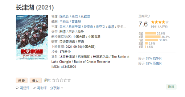 | 今年國慶檔電影中,吳京主演的戰(zhàn)爭大片《長津湖》票房已經(jīng)領跑,上映不到2天時間票房超過了6億,并打破了中國影史11項記錄。 作為中國電影史上制作規(guī)模最大、參與人數(shù)最多的電影,《長津湖》以一部大片的擔綱掀起國慶檔的觀影熱潮。 截至10月1日20時35分,在《長津湖》《我和我的父輩》等頭部影片的帶動下,國慶檔首日票房已突破6億元,暫列國慶檔首日票房影史第三。 電影《長津湖》不到2天時間票房累計突破6億元,創(chuàng)中國影史單日票房等11項影史紀錄,目前豆瓣開分7.6分。 《長津湖》在國慶首日3.89億的票房也超越了2020年國慶單日冠軍《姜子牙》的3.63億,和2019年同期《我和我的祖國》3.88億的成績,成為中國電影史國慶檔影片單日票房的冠軍。 《長津湖》由陳凱歌、林超賢、徐克執(zhí)導,吳京、易烊千璽領銜主演,段奕宏特別主演,朱亞文、李晨、韓東君主演,胡軍特邀主演,張涵予友情主演。 影片以長津湖戰(zhàn)役為背景,講述了一個志愿軍連隊在極度嚴酷環(huán)境下堅守陣地奮勇殺敵,為長津湖戰(zhàn)役勝利作出重要貢獻的感人故事。 |