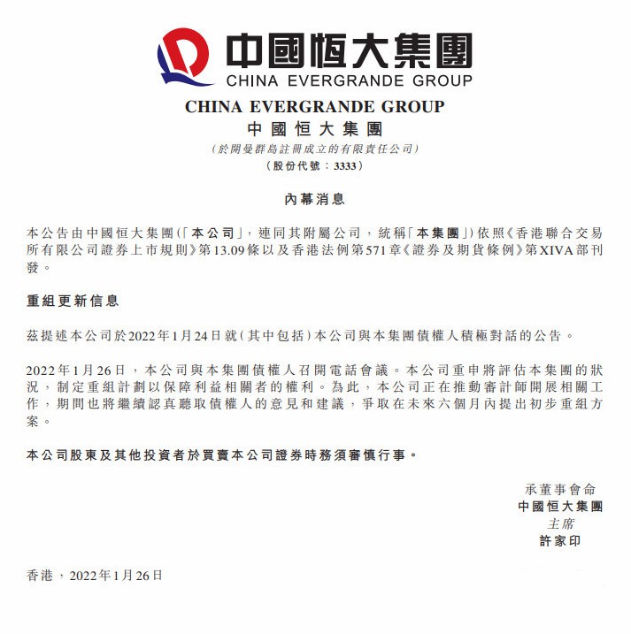 1月26日消息,今日晚間,中國恒大在港交所公告,公司與集團債權(quán)人召開電話會議。公司重申將評估集團的狀況,制定重組計劃以保障利益相關(guān)者的權(quán)利。 為此,公司正在推動審計師開展相關(guān)工作,期間也將繼續(xù)認(rèn)真聽取債權(quán)人的意見和建議,爭取在未來六個月內(nèi)提出初步重組方案。 電話會議上,中國恒大執(zhí)行董事肖恩表示,中國恒大董事會及風(fēng)險化解委員會及管理團隊,正共同制定全面、細(xì)致、有效的計劃,研究各種潛在方案,計劃于未來6個月內(nèi)推出初步重組方案。 據(jù)界面新聞消息,恒大高管指出,為應(yīng)對當(dāng)前的運營挑戰(zhàn),2021年12月6日設(shè)立風(fēng)險化解委員會,成員包括公司高管、相關(guān)單位的高管和專業(yè)人士,可以充分調(diào)用資源。同時,會借助于專業(yè)人士的意見和國際經(jīng)驗,公平對待各類投資人。 值得一提的是,1月1日,許家印在給恒大全體員工的新年致辭中透露,目前恒大全國項目復(fù)工率已達(dá)91.7%,復(fù)工人數(shù)8.9萬人,四季度累計交樓超過5.3萬套。 他還表示恒大要永不放棄,毫不動搖地把保交樓進(jìn)行到底,要恢復(fù)銷售、恢復(fù)經(jīng)營、還清各方面的債務(wù),創(chuàng)造一個涅槃重生的美好未來。 |