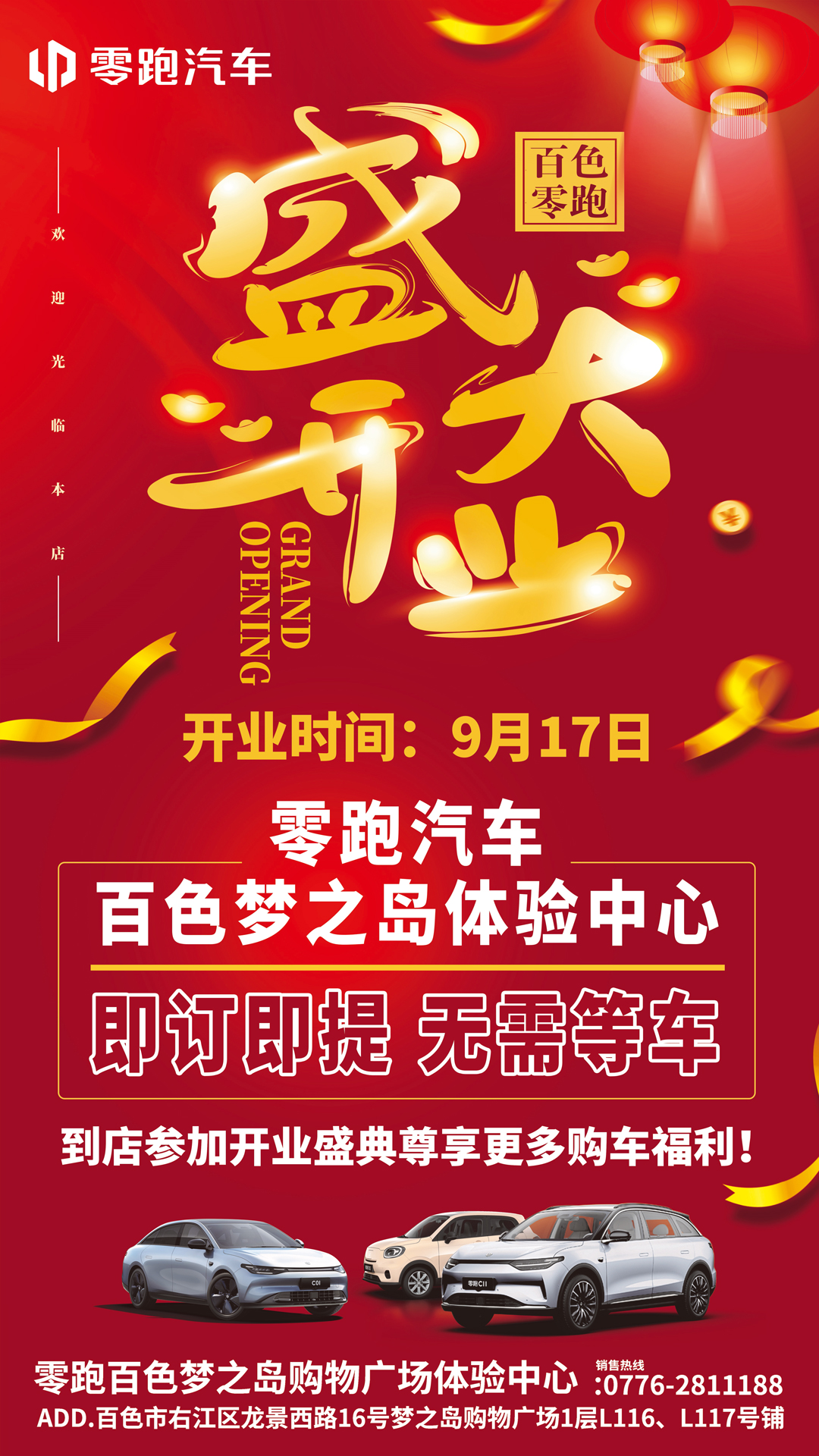 零跑品牌進(jìn)駐百色夢(mèng)之島商場(chǎng) 9月17日盛大開(kāi)業(yè) 既訂即提,無(wú)需等車! 現(xiàn)本店有試乘試駕體驗(yàn)車 可以線上預(yù)約上門體驗(yàn),歡迎蒞臨賞車購(gòu)車 T03,首付9900,日供低至48元 本月下定零跑T03可享3重好禮: 1、終身免費(fèi)三電質(zhì)保。 2、終身免費(fèi)道路救援。 3、終身免費(fèi)維保取送車。 C11,0利息,日供低至16元。 本月下定零跑C11可享: 1、至高6000金融補(bǔ)貼。 2、16年50萬(wàn)公里三電質(zhì)保。 開(kāi)業(yè)當(dāng)天到店參加開(kāi)業(yè)盛典尊享更多購(gòu)車福利! 零跑汽車百色夢(mèng)之島店 零跑百色夢(mèng)之島購(gòu)物廣場(chǎng)體驗(yàn)中心 地址:百色市右江區(qū)龍景西路16號(hào)夢(mèng)之島購(gòu)物廣場(chǎng)1層L116-L117號(hào)商鋪 銷售熱線:0776-2811188 |