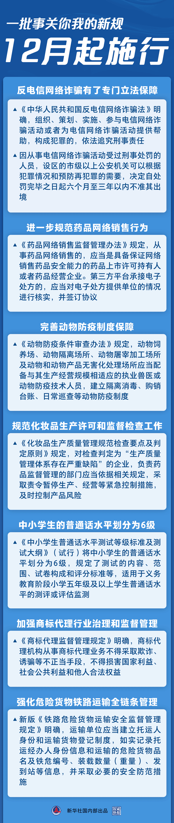 新華社北京11月30日電題:12月,一批事關(guān)你我的新規(guī)開始施行 新華社記者白陽 2022年的最后一個月,一批事關(guān)你我的新規(guī)開始施行。反電信網(wǎng)絡(luò)詐騙有了專門立法保障,中小學(xué)生的普通話水平有了規(guī)范標(biāo)準(zhǔn),藥品網(wǎng)絡(luò)銷售平臺責(zé)任進一步壓實……法治,為美好生活助力。 為懲治電信網(wǎng)絡(luò)詐騙“精準(zhǔn)出招” 《中華人民共和國反電信網(wǎng)絡(luò)詐騙法》自2022年12月1日起施行。 反電信網(wǎng)絡(luò)詐騙法從人員鏈、信息鏈、技術(shù)鏈、資金鏈等進行全鏈條治理,從前端宣傳預(yù)防、中端監(jiān)測處置、后端懲治進行全流程治理,強化部門監(jiān)管主體責(zé)任,壓實企業(yè)責(zé)任,對電詐分子規(guī)定了有效預(yù)防懲處措施,嚴(yán)厲打擊各類涉詐黑灰產(chǎn)行為。 反電信網(wǎng)絡(luò)詐騙法規(guī)定,公安機關(guān)要會同有關(guān)部門、企業(yè)建立預(yù)警勸阻系統(tǒng),對發(fā)現(xiàn)的潛在被害人及時采取相應(yīng)勸阻措施。 對前往涉詐嚴(yán)重地區(qū)且出境活動存在重大涉詐嫌疑的,或者因電信網(wǎng)絡(luò)詐騙受過刑事處罰的,反電信網(wǎng)絡(luò)詐騙法規(guī)定,可以根據(jù)情況采取出境限制措施。 中小學(xué)生的普通話水平劃分為6級 《中小學(xué)生普通話水平測試等級標(biāo)準(zhǔn)及測試大綱》(試行)自2022年12月15日起試行。該規(guī)范將中小學(xué)生的普通話水平劃分為6級,規(guī)定了測試的內(nèi)容、范圍、試卷構(gòu)成和評分標(biāo)準(zhǔn)等,適用于義務(wù)教育階段小學(xué)五年級及以上學(xué)生普通話水平的測評或評估監(jiān)測。 新修訂的《漢字部首表》也將于2022年12月15日起實施。在保持原有201個主部首基礎(chǔ)上,增補微調(diào)個別附形部首,并給出部分常用部首名稱和部首的信息處理國際編碼。 壓實藥品網(wǎng)絡(luò)銷售平臺責(zé)任 《藥品網(wǎng)絡(luò)銷售監(jiān)督管理辦法》自2022年12月1日起施行。 辦法明確了從事藥品網(wǎng)絡(luò)銷售的藥品經(jīng)營企業(yè)主體資格和要求,并依法明確疫苗、血液制品、麻醉藥品、精神藥品等國家實行特殊管理的藥品不得在網(wǎng)絡(luò)上銷售。 辦法要求對處方藥網(wǎng)絡(luò)銷售實行實名制,并按規(guī)定進行處方審核調(diào)配;規(guī)定處方藥與非處方藥應(yīng)當(dāng)區(qū)分展示,并明確在處方藥銷售主頁面、首頁面不得直接公開展示包裝、標(biāo)簽等信息;通過處方審核前,不得展示說明書等信息,不得提供處方藥購買的相關(guān)服務(wù)。 規(guī)范化妝品生產(chǎn)許可和監(jiān)督檢查工作 《化妝品生產(chǎn)質(zhì)量管理規(guī)范檢查要點及判定原則》自2022年12月1日起施行。 該原則明確了藥監(jiān)部門開展生產(chǎn)許可現(xiàn)場核查、生產(chǎn)許可延續(xù)后現(xiàn)場核查、日常監(jiān)督檢查的具體情形和相關(guān)判定原則。 對檢查判定為“生產(chǎn)質(zhì)量管理體系存在嚴(yán)重缺陷”的企業(yè),負(fù)責(zé)藥品監(jiān)督管理的部門應(yīng)當(dāng)依據(jù)相關(guān)規(guī)定,采取責(zé)令暫停生產(chǎn)、經(jīng)營等緊急控制措施,及時控制產(chǎn)品風(fēng)險。企業(yè)應(yīng)當(dāng)在規(guī)定的時間內(nèi)完成整改,并向負(fù)責(zé)藥品監(jiān)督管理的部門提交整改報告。 對檢查判定為“生產(chǎn)質(zhì)量管理體系存在嚴(yán)重缺陷”的企業(yè),負(fù)責(zé)藥品監(jiān)督管理的部門應(yīng)當(dāng)根據(jù)相關(guān)規(guī)定立案調(diào)查。 完善商標(biāo)代理行業(yè)治理監(jiān)管 《商標(biāo)代理監(jiān)督管理規(guī)定》自2022年12月1日起施行,針對商標(biāo)代理行業(yè)準(zhǔn)入門檻低、機構(gòu)過多過濫、經(jīng)營管理不規(guī)范、服務(wù)水平參差不齊等問題細(xì)化監(jiān)管規(guī)定。 規(guī)定要求,商標(biāo)代理機構(gòu)建立健全業(yè)務(wù)管理制度和業(yè)務(wù)檔案制度,加強從業(yè)人員職業(yè)道德和職業(yè)紀(jì)律教育。商標(biāo)代理機構(gòu)從事商標(biāo)代理業(yè)務(wù)不得采取欺詐、誘騙等不正當(dāng)手段,不得損害國家利益、社會公共利益和他人合法權(quán)益。 加強鐵路危險貨物運輸安全管理 新版《鐵路危險貨物運輸安全監(jiān)督管理規(guī)定》自2022年12月1日起施行。 針對非法托運危險貨物問題,規(guī)定建立了托運人在危險貨物確定品類、防護措施、專門辦理站點、提交證明材料、運單填報、應(yīng)急聯(lián)系等方面制度;針對違規(guī)承運危險貨物問題,規(guī)定建立了安全查驗、違規(guī)托運告知、簽訂安全協(xié)議等制度。 對包裝、數(shù)量、危險物質(zhì)含量等符合要求的危險貨物,如含鋰電池的消費類電子產(chǎn)品、含碘小于50%的碘酒、醫(yī)藥用的四氯乙烯等,在滿足一定條件的情況下不作為危險貨物運輸。 強化養(yǎng)殖業(yè)生產(chǎn)安全和公共衛(wèi)生安全 新版《動物檢疫管理辦法》和《動物防疫條件審查辦法》自2022年12月1日起施行。 新版《動物檢疫管理辦法》明確農(nóng)業(yè)農(nóng)村主管部門負(fù)責(zé)動物檢疫監(jiān)督管理,動物疫病預(yù)防控制機構(gòu)提供有關(guān)技術(shù)支撐,對受理輸入無疫區(qū)的動物、動物