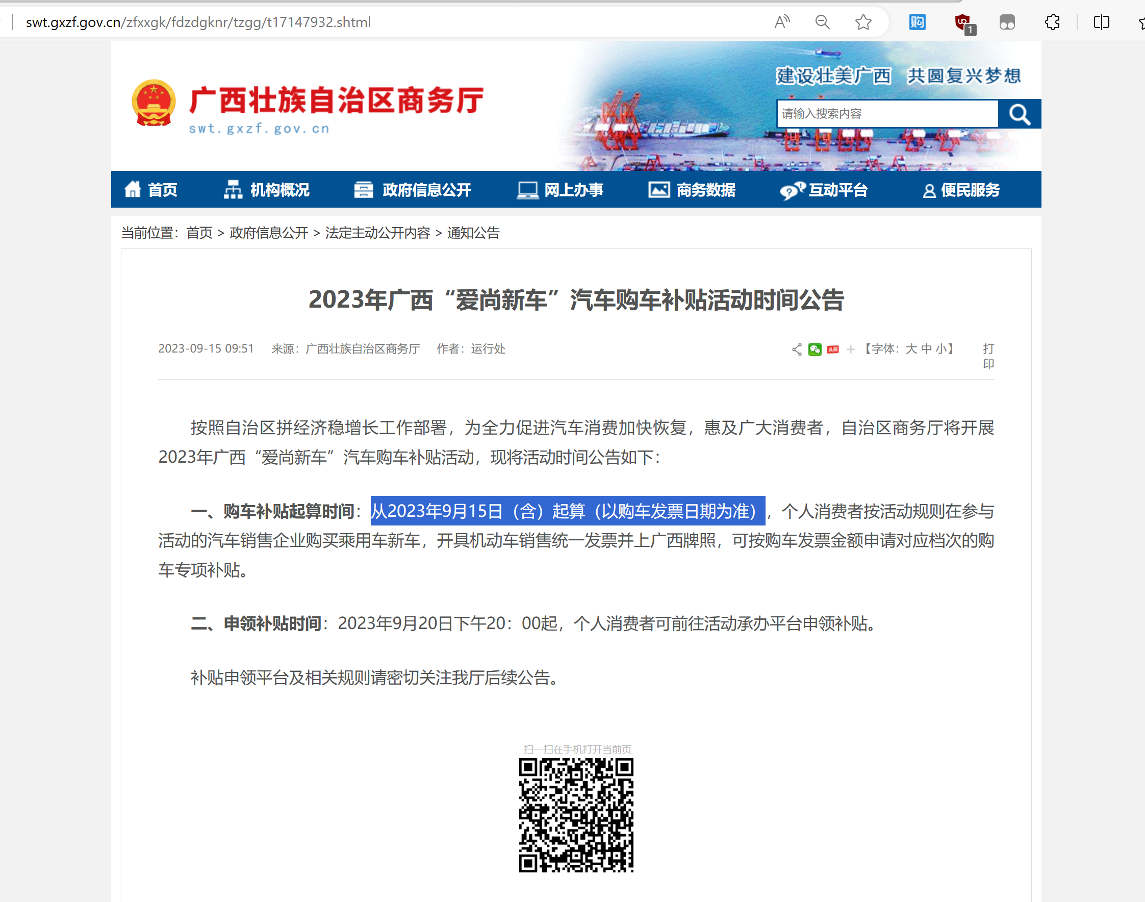 | 按照自治區(qū)拼經濟穩(wěn)增長工作部署,為全力促進汽車消費加快恢復,惠及廣大消費者,自治區(qū)商務廳將開展2023年廣西“愛尚新車”汽車購車補貼活動,現將活動時間公告如下: 一、購車補貼起算時間:從2023年9月15日(含)起算(以購車發(fā)票日期為準),個人消費者按活動規(guī)則在參與活動的汽車銷售企業(yè)購買乘用車新車,開具機動車銷售統一發(fā)票并上廣西牌照,可按購車發(fā)票金額申請對應檔次的購車專項補貼。 二、申領補貼時間:2023年9月20日下午20:00起,個人消費者可前往活動承辦平臺申領補貼。 補貼申領平臺及相關規(guī)則請密切關注我廳后續(xù)公告。 來源:廣西壯族自治區(qū)商務廳 |